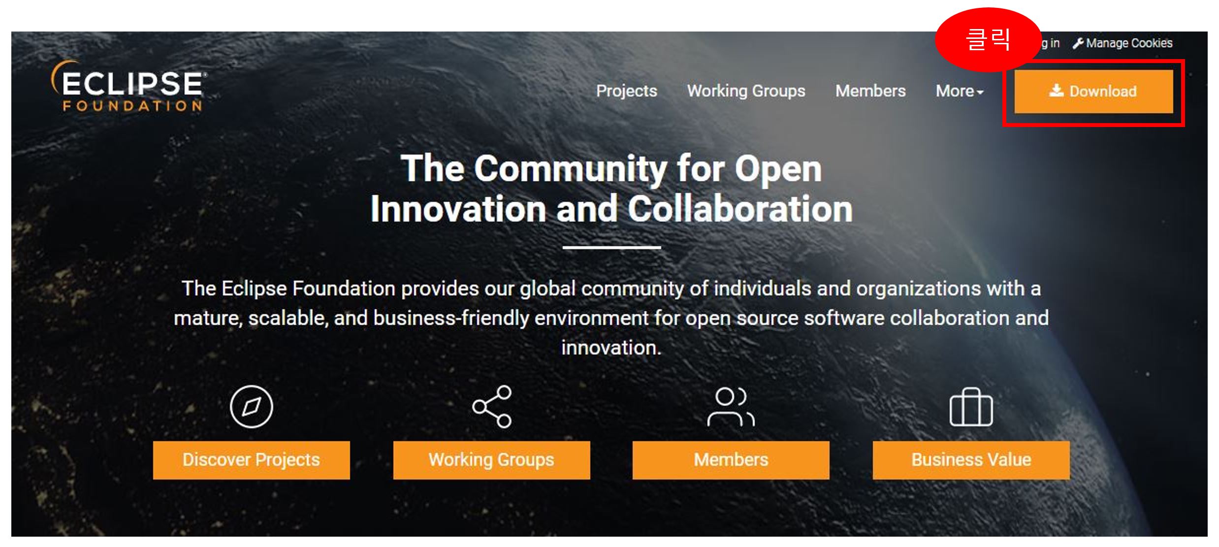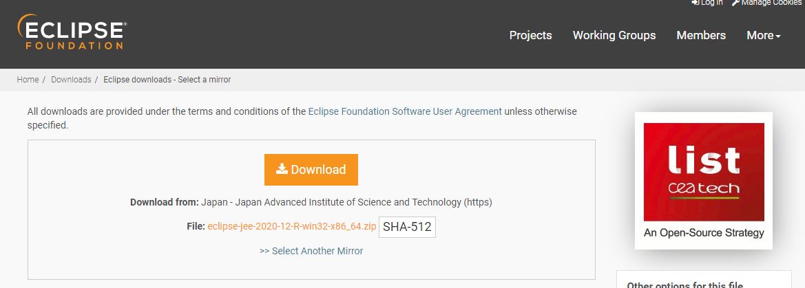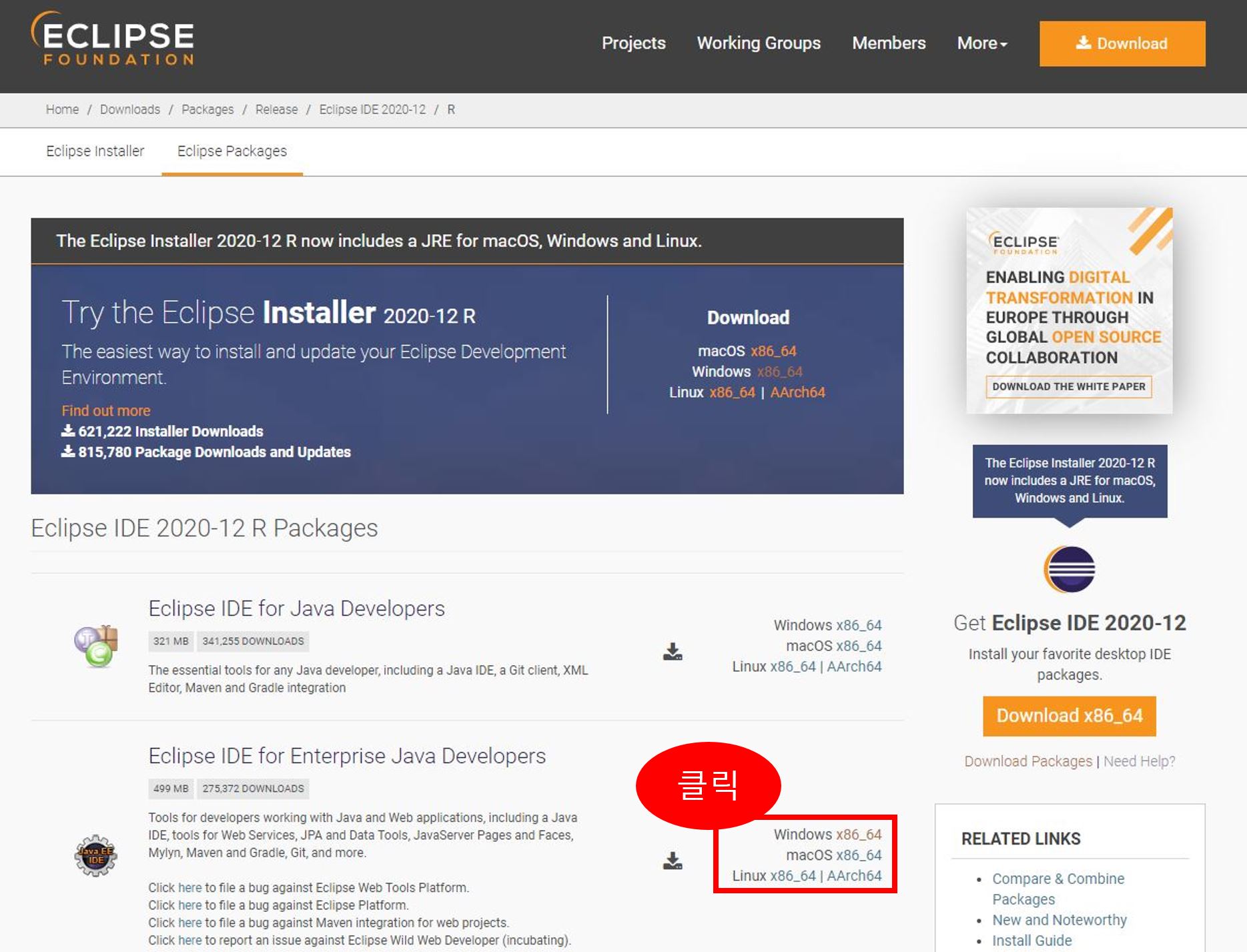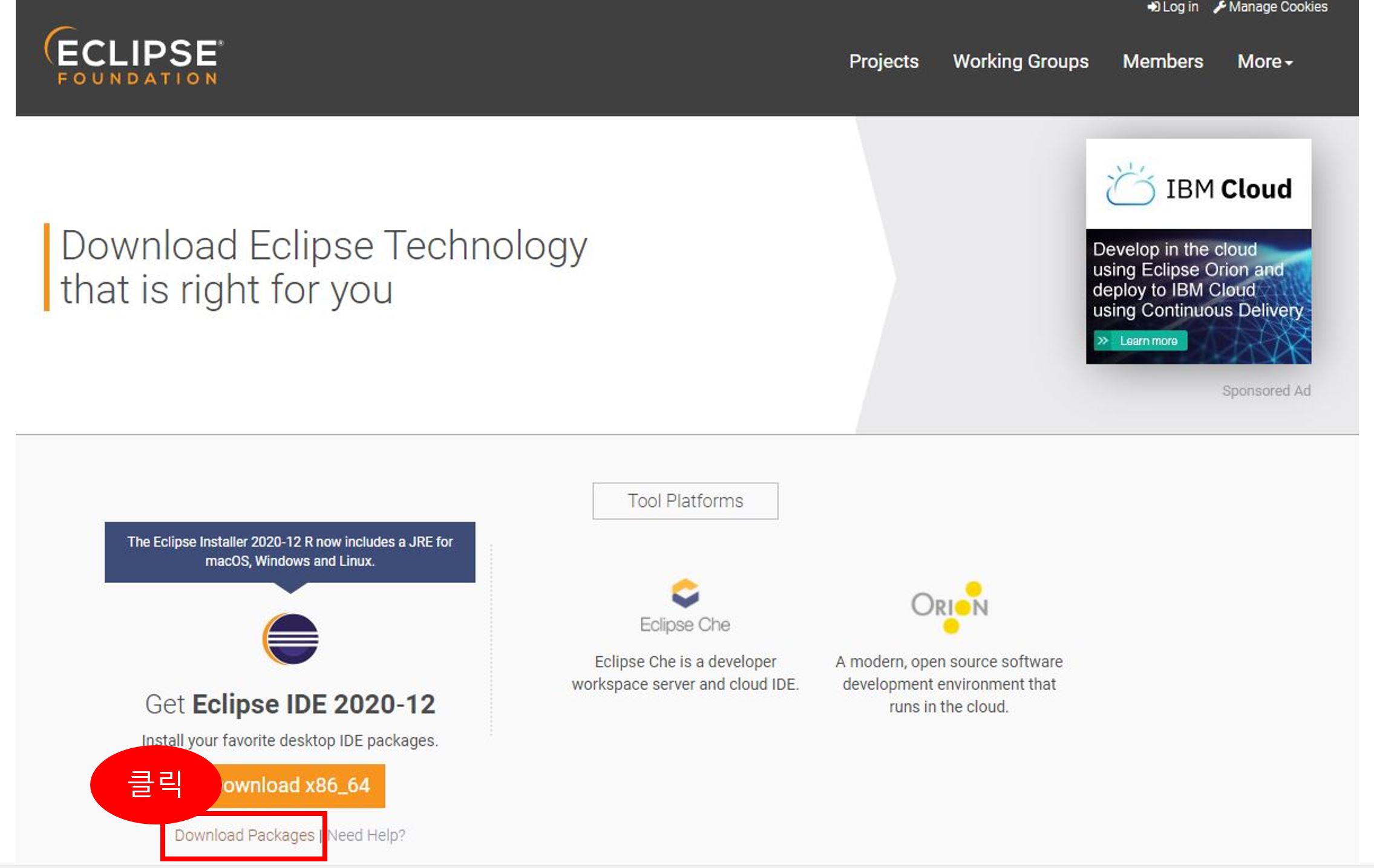 위 URL 로 이동하고 아래 그림 순서대로 페이지를 이동하고 이클립스를 다운받는다.