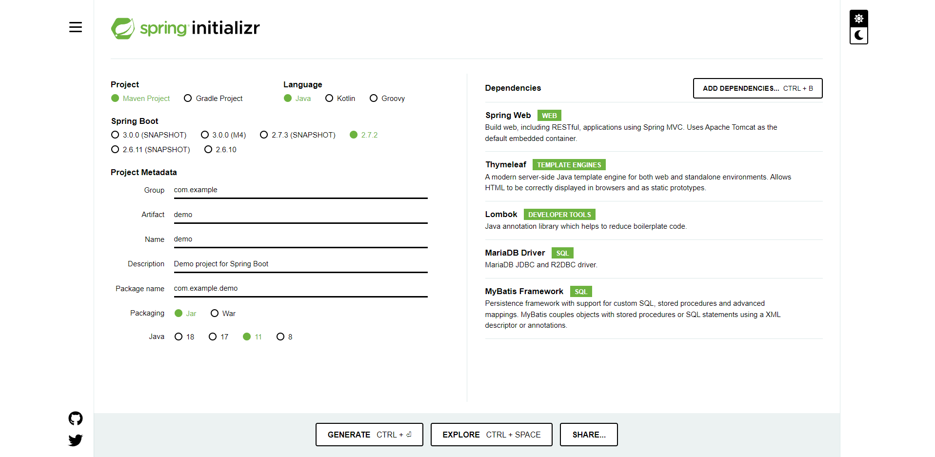 - Spring Boot - 2.7.2 (기본선택) => 자주 변경되니 크게 신경쓰지 않아도 됩니다