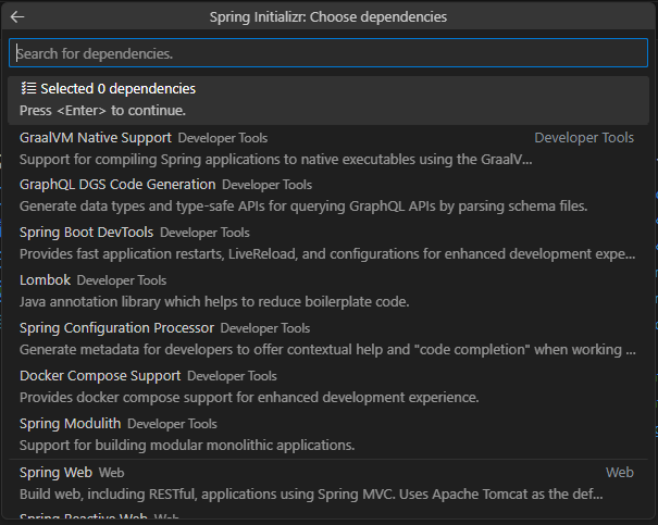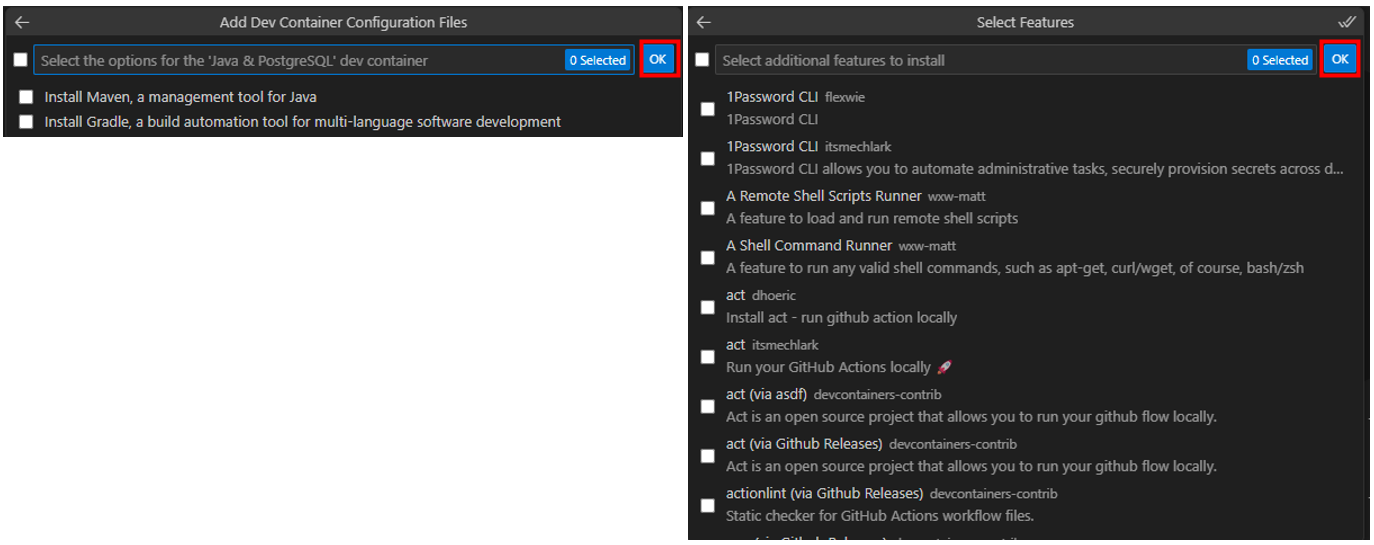 - Select the options for the ' Java & PostgreSQL ' dev container 와 Select additional featuers to install 에서는 아무것도 선택하지 않고 OK 버튼을 클릭하세요.