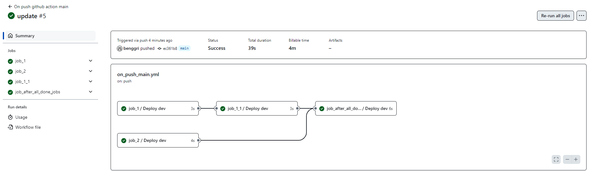 on_push_action.yml 에서 job_1.yml, job_1_1.yml, job_2.yml, job_after_all_done_jobs.yml 파일을 호출하는 형태로 구성됩니다.