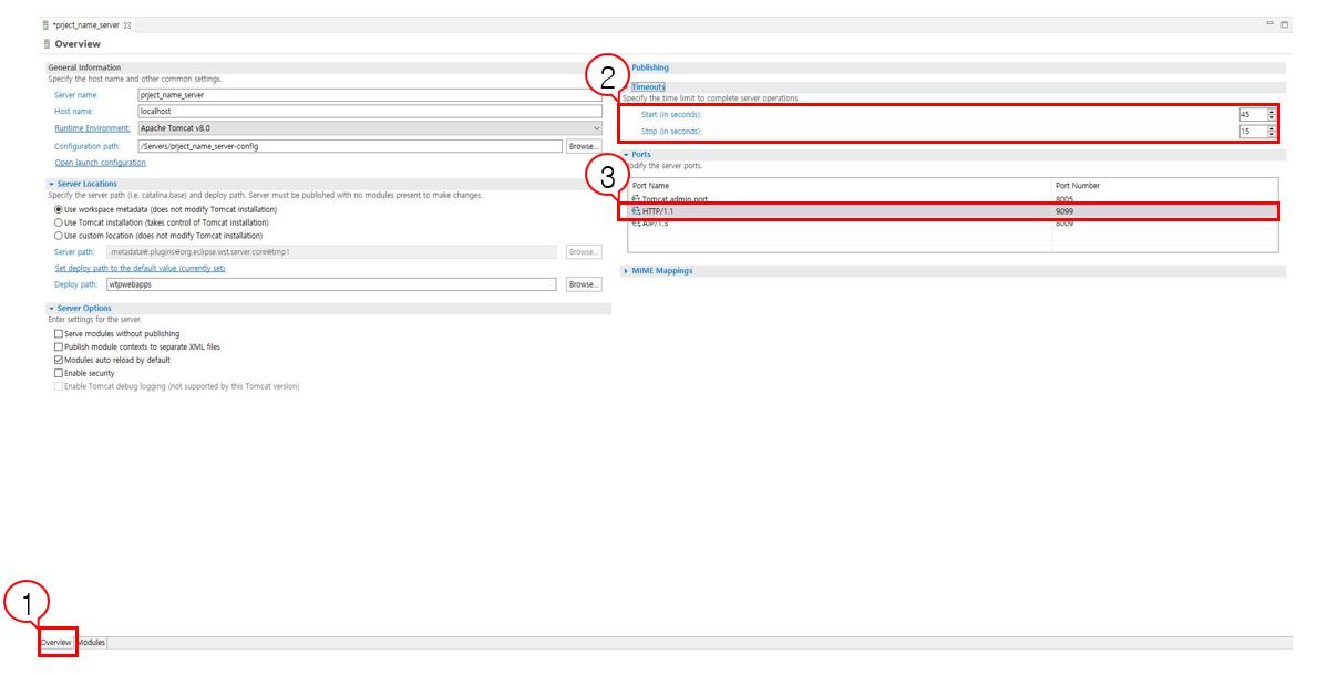 숫자 3에 위치한 Ports 부분에서 HTTP/1.1 부분이 웹 브라우저에 접근할 Port 가 된다.( 9099 로 설정 )