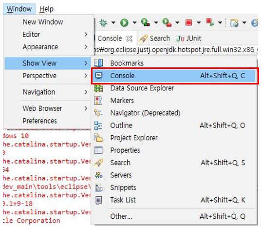 서버를 기동하고 잘 기동되었는지 확인하기 위해서 이클립스 Console 화면을 표시한다.