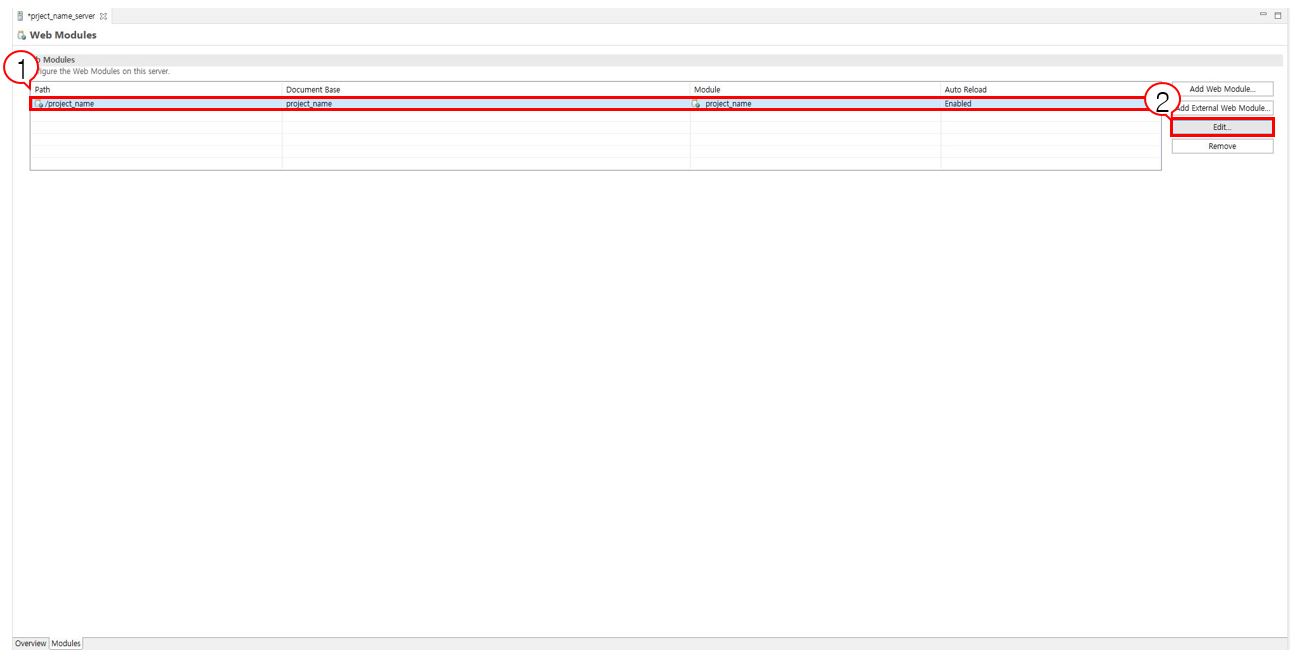 숫자 1에 위치한 Web Module(생성한 프로젝트) 을 클릭하고 숫자 2에 위치한 Edit 를 클릭한다.