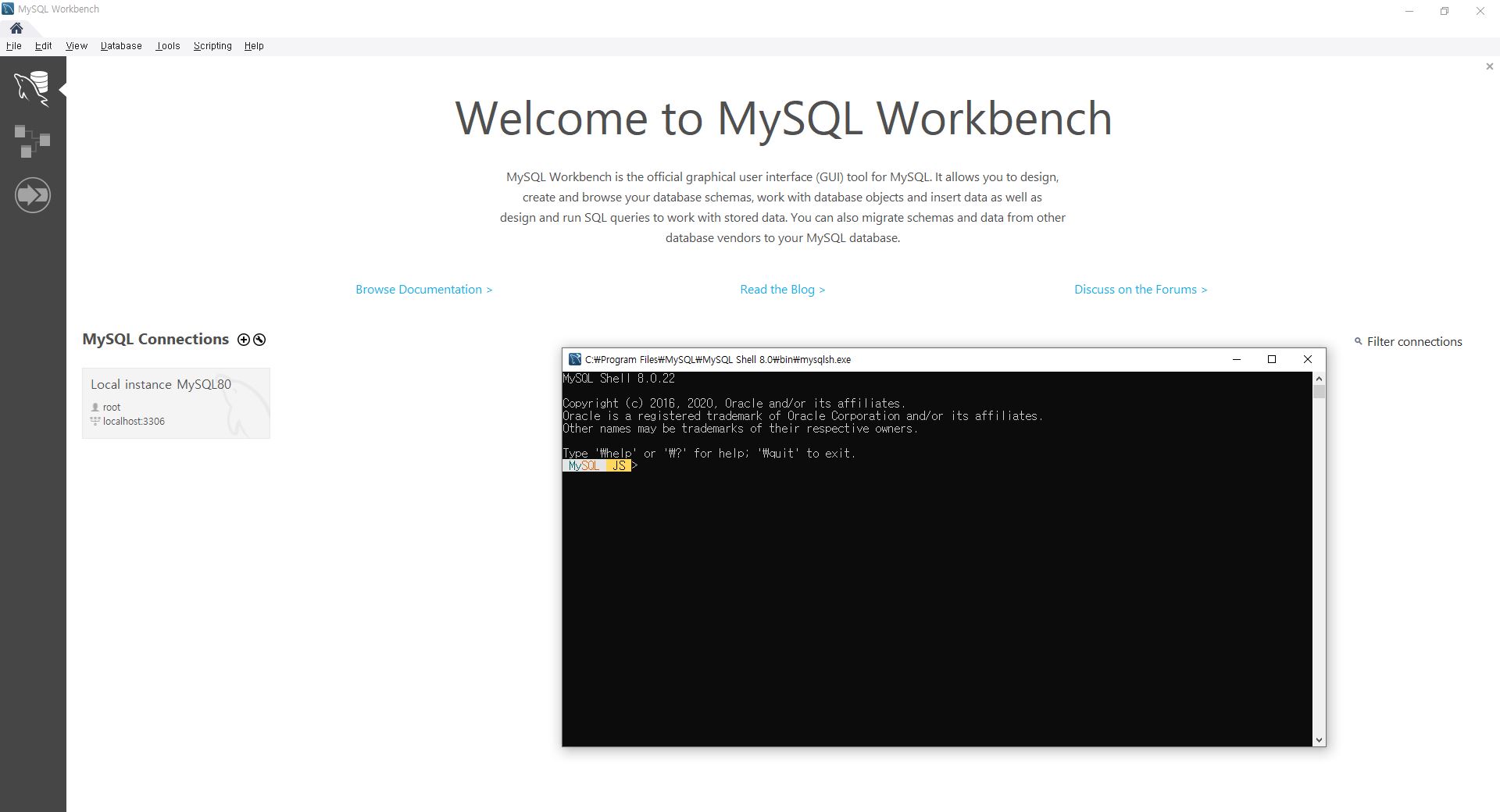 모든 작업이 끝날 경우 아래의 그림과 같이 cmd 창이 표시되고 MySQL Workbench 가 실행된다.