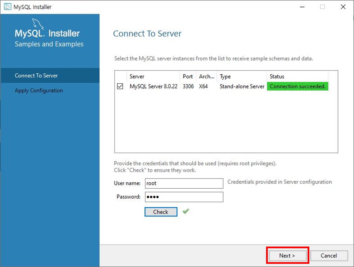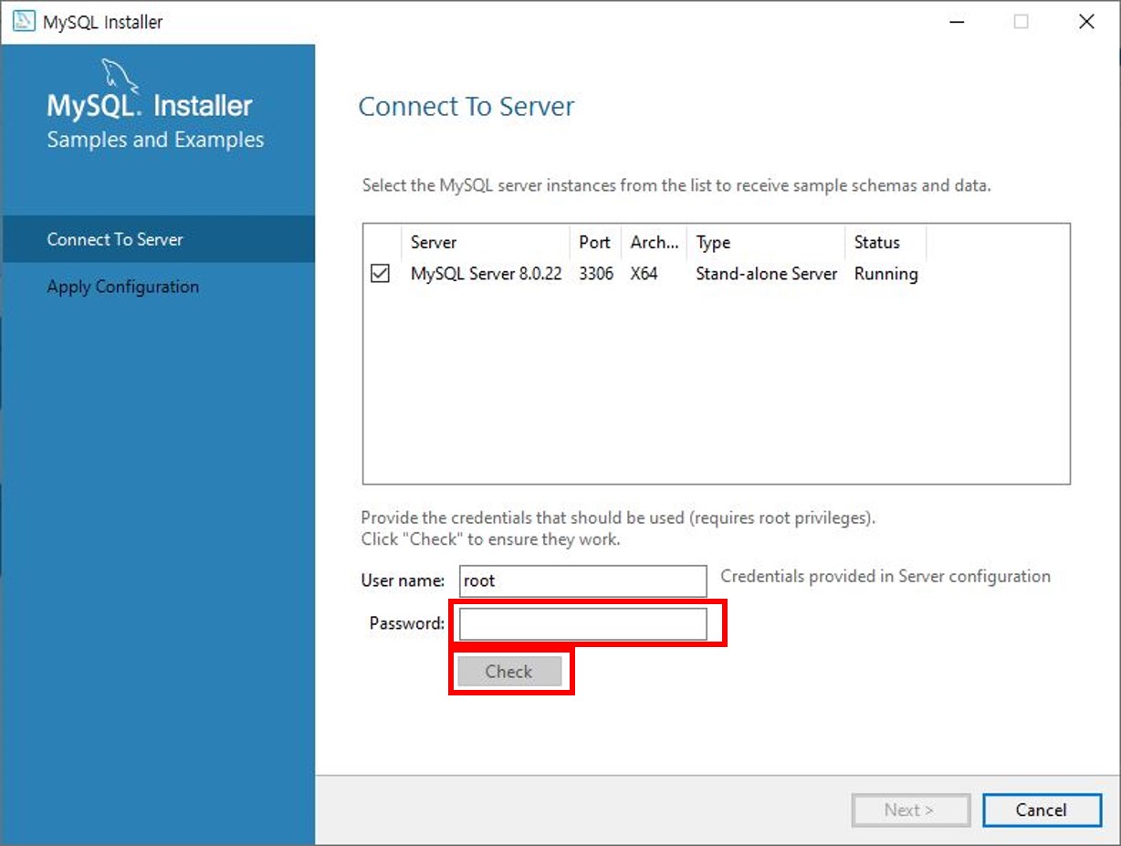 위에서 설정한 root 계정의 비밀번호를 입력 후 Check 버튼을 누른다.