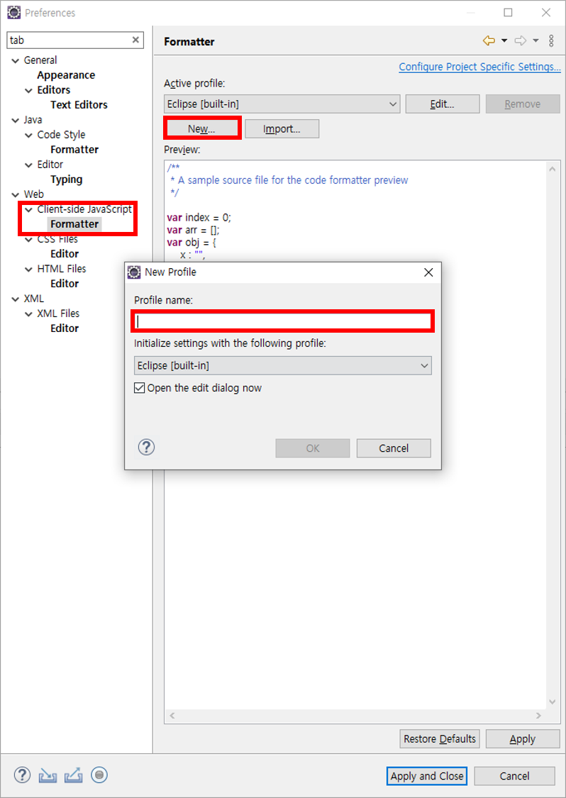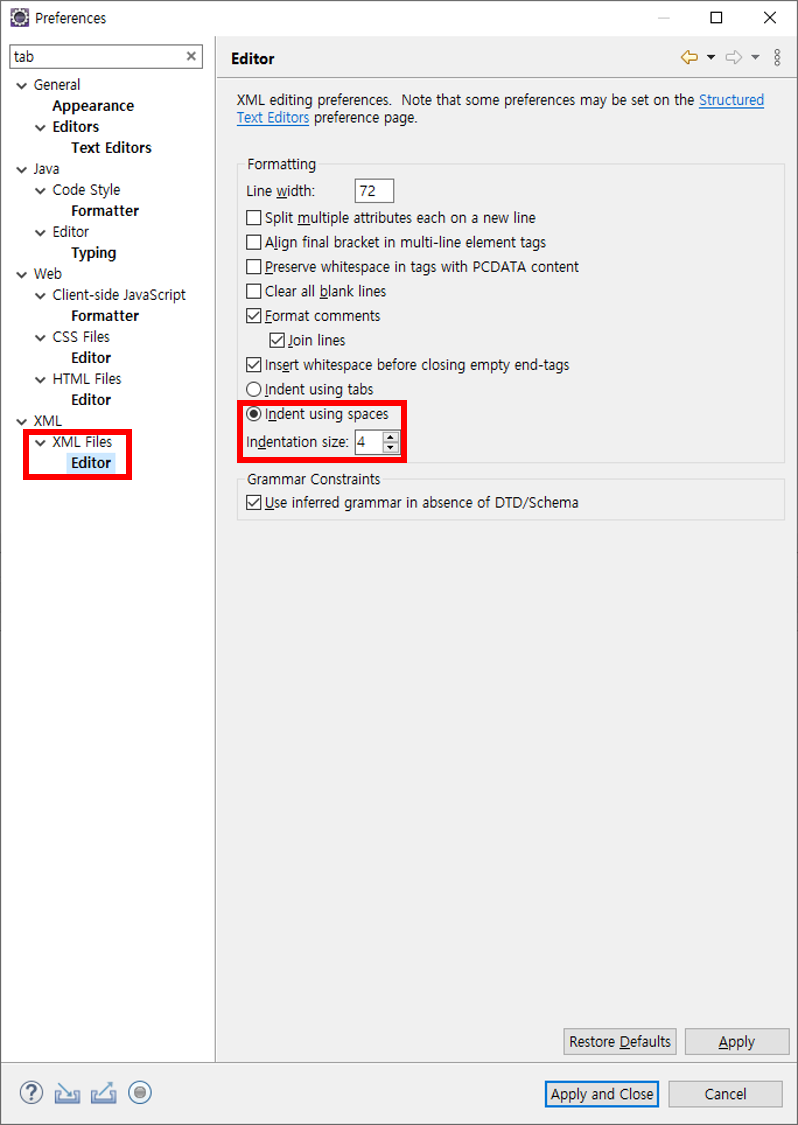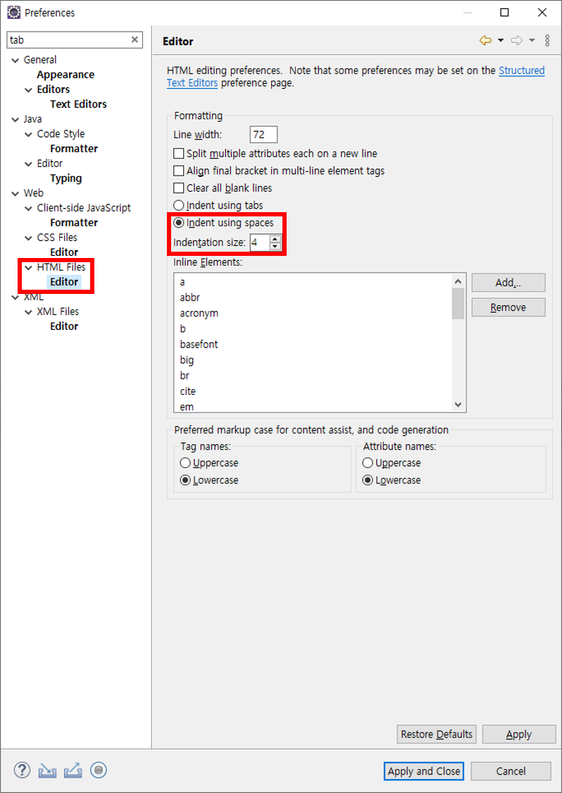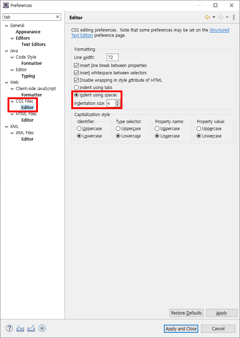 ※ CSS, HTML, XML 은 설정 화면이 다른데 Indent using spaces 를 선택하고 Indentation size 는 개발표준을 따른다.