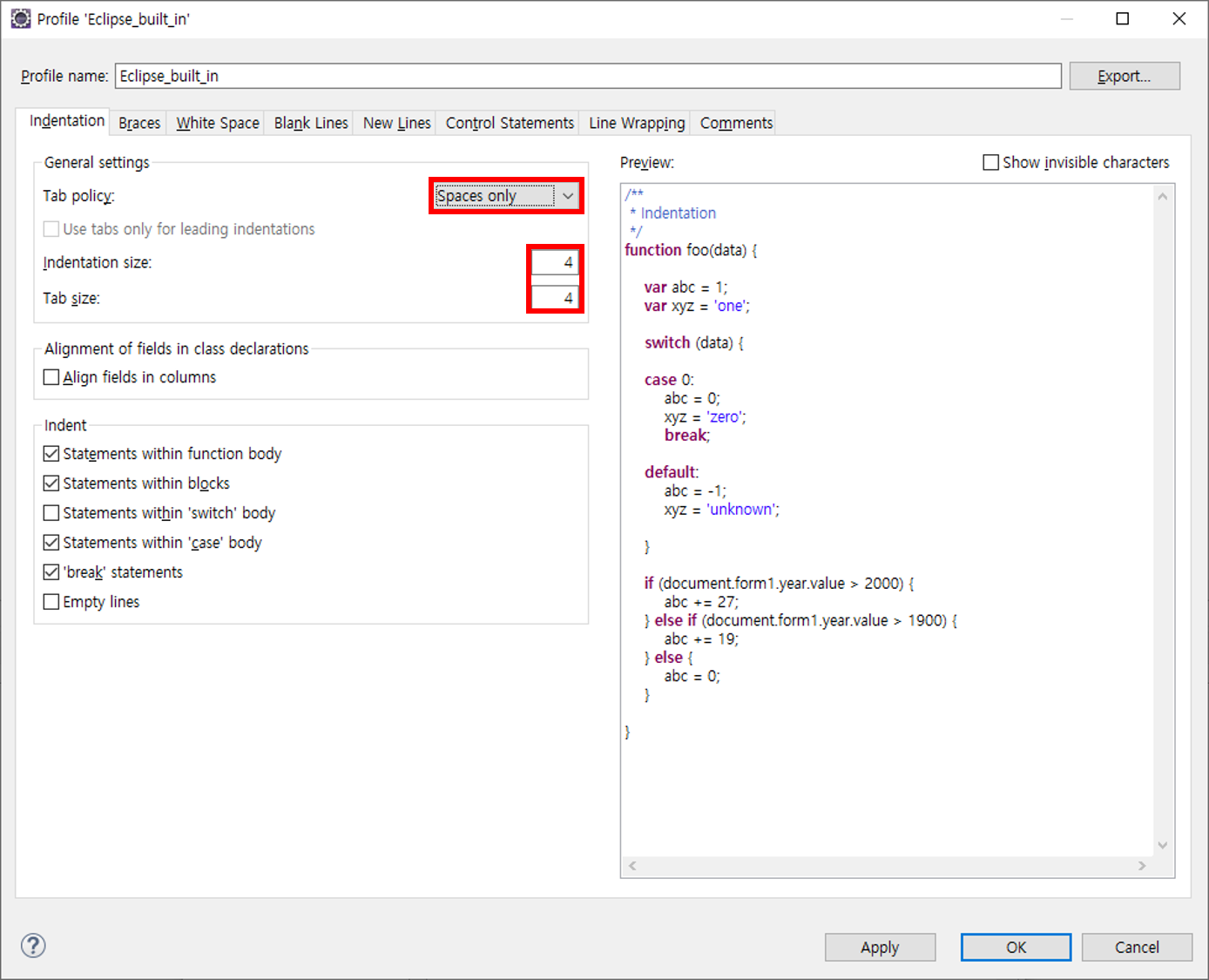 indentation size : 개발 표준을 따른다.