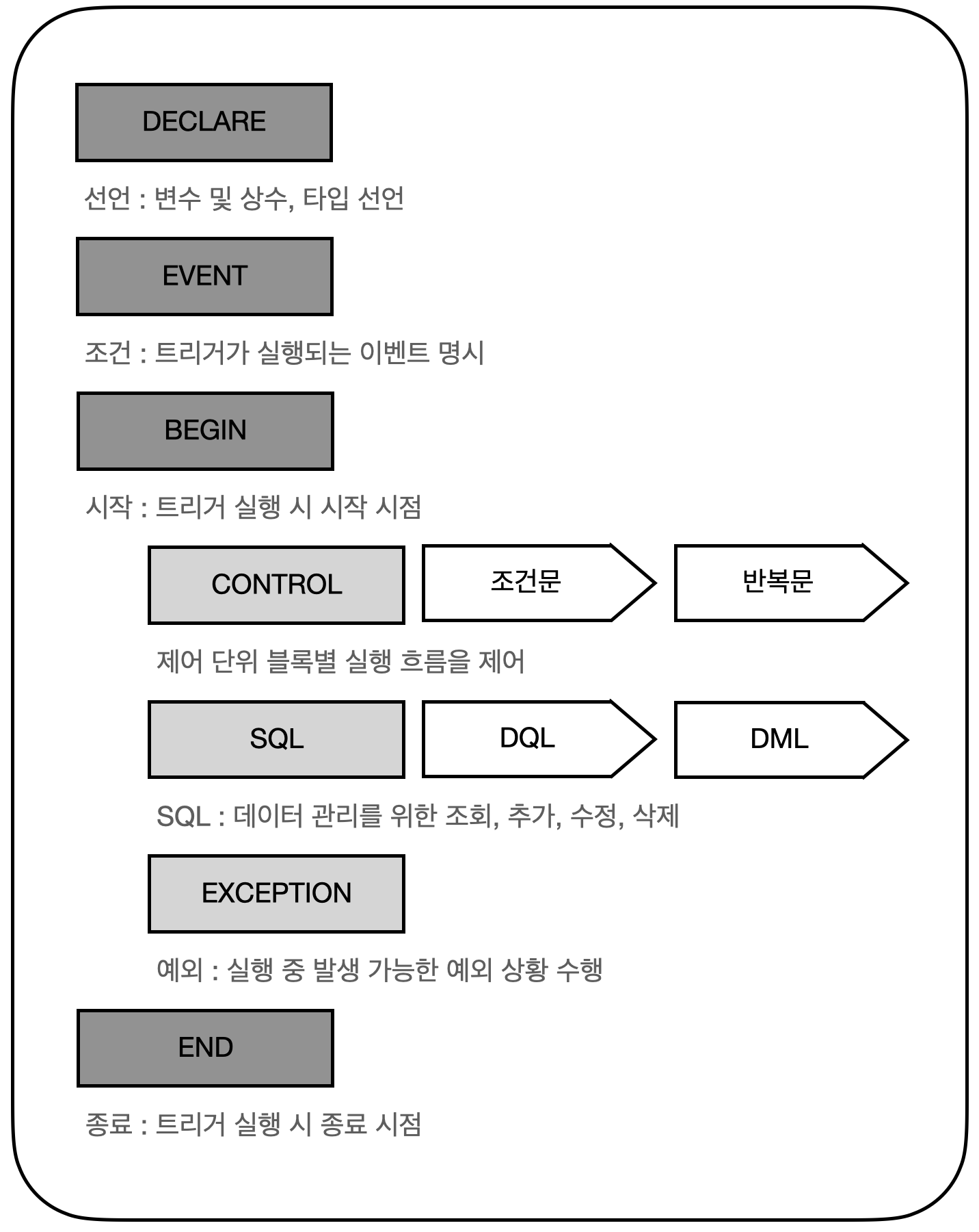 | 시작/종료부(BEGIN/END) | 트리거의 시작과 종료를 표현하며, BEGIN/END가 쌍을 이룸 다수 실행을 제어하는 기본적 단위가 되며 논리적 프로세스를 구성 |